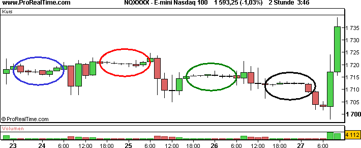 Zu Zeiten mit wenig Kauf- und Verkaufaktivitäten, wie z.B. kurz vor Börsenschluss oder während der Mittagszeit, entspannt sich der Markt für gewöhnlich etwas. Ein klassischer 2-Stunden-Chart, wie im obigen Beispiel, zeigt Ihnen während dieser Perioden viele kleine Kerzen ohne grundlegende Information an.