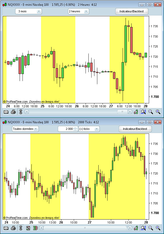 Ces deux graphiques représentent l'E-mini Nasdaq sur la même période, mais la vue en (x) ticks vous apporte 5 atouts supplémentaires qui améliorent votre analyse !