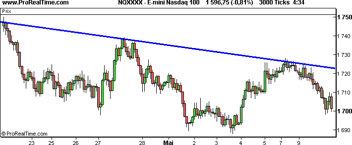 Observez l'E-mini Nasdaq 100 entre le 23 Avril et le 10 Mai. La valeur est bien sûr en tendance baissière.