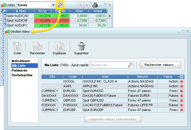 - La fenêtre "Gestion listes" : sélectionnez votre liste puis cliquez sur le bouton "Ajouter valeurs" pour rechercher des valeurs à ajouter ou sélectionnez le/les instruments que vous souhaitez supprimer de votre liste puis cliquez sur "Supprimer valeurs sélectionnées".