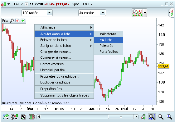 - Une liste : depuis une liste, effectuez un clic-droit sur la valeur de votre choix puis choisissez "Ajouter dans la liste" ou "Enlever de la liste", et cliquez sur le nom de la liste concernée. Cette fonction vous sera particulièrement utile pour ajouter à une liste personnelle une valeur détectée par un palmarès ou un scan de marché.