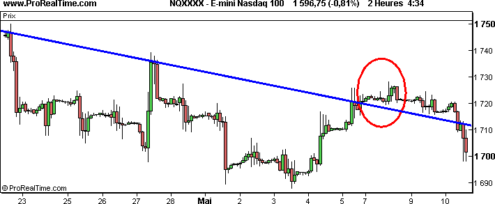 Observez l'E-mini Nasdaq 100 entre le 23 Avril et le 10 Mai. La valeur est bien sûr en tendance baissière.
